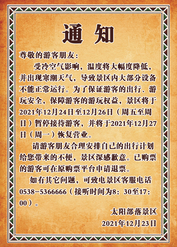 2021年12月24日-2021年12月26日閉園通知